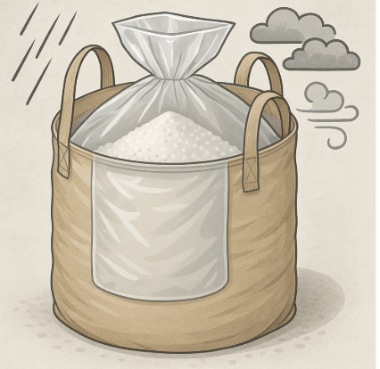 丸型・大型(1,500L以上)・内袋付きフレコンバッグの最大の特長は、内袋が内容物をしっかり守ることです。内袋は高密度ポリエチレンなど耐湿・耐破損性の高い素材を使用し、雨・湿気・粉塵の侵入を防止します。
