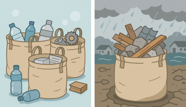 地震・洪水・台風などで発生する大量の廃棄物を迅速に収集・保管するためには、防湿性と耐久性を備えた丸型・大型(1,500L以上)・内袋付きフレコンバッグが不可欠です。