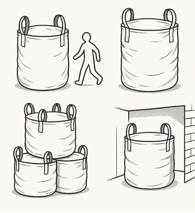 丸型の構造は荷重が均等に分散されるため、積み重ね時に形崩れが少なく安定性に優れます。丸型・小型(~500L未満)・ラミネーション無フレコンバッグは、狭い倉庫内や限られた保管スペースでも効率的に積み上げることが可能です。