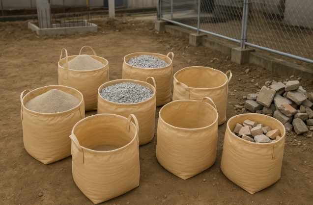 建設現場では、大量のフレコンバッグを必要としない小規模な作業も多くあります。丸型・小型(~500L未満)・ラミネーション無フレコンバッグは、砂や砕石、軽量な建設廃材の集積に最適で、少量ごとの運搬が容易です。