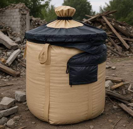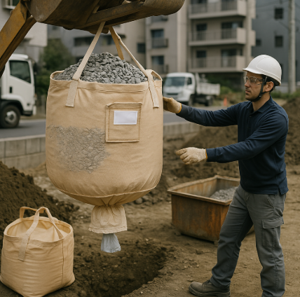 建設や土木現場では、砂・砕石・産業廃棄物などの資材運搬が頻繁に発生します。ここでも丸型・小型・付属品付きフレコンバッグが活躍します。