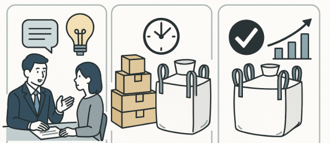 株式会社平成では、お客様の依頼内容に基づき、最適な付属品・中型(500L~1,500L未満)・排出口なしフレコンバッグを提案し、導入から運用までをトータルでサポートします。