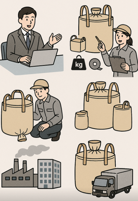 これらの付属品を自由に組み合わせることで、建設現場・農業倉庫・リサイクル施設・防災備蓄など、依頼者の現場条件に最適化されたフレコンバッグをお勧めできます。