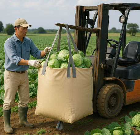 収穫期に大量の農産物を効率的に集荷・出荷するために、角型中型フレコンバッグが利用されています。