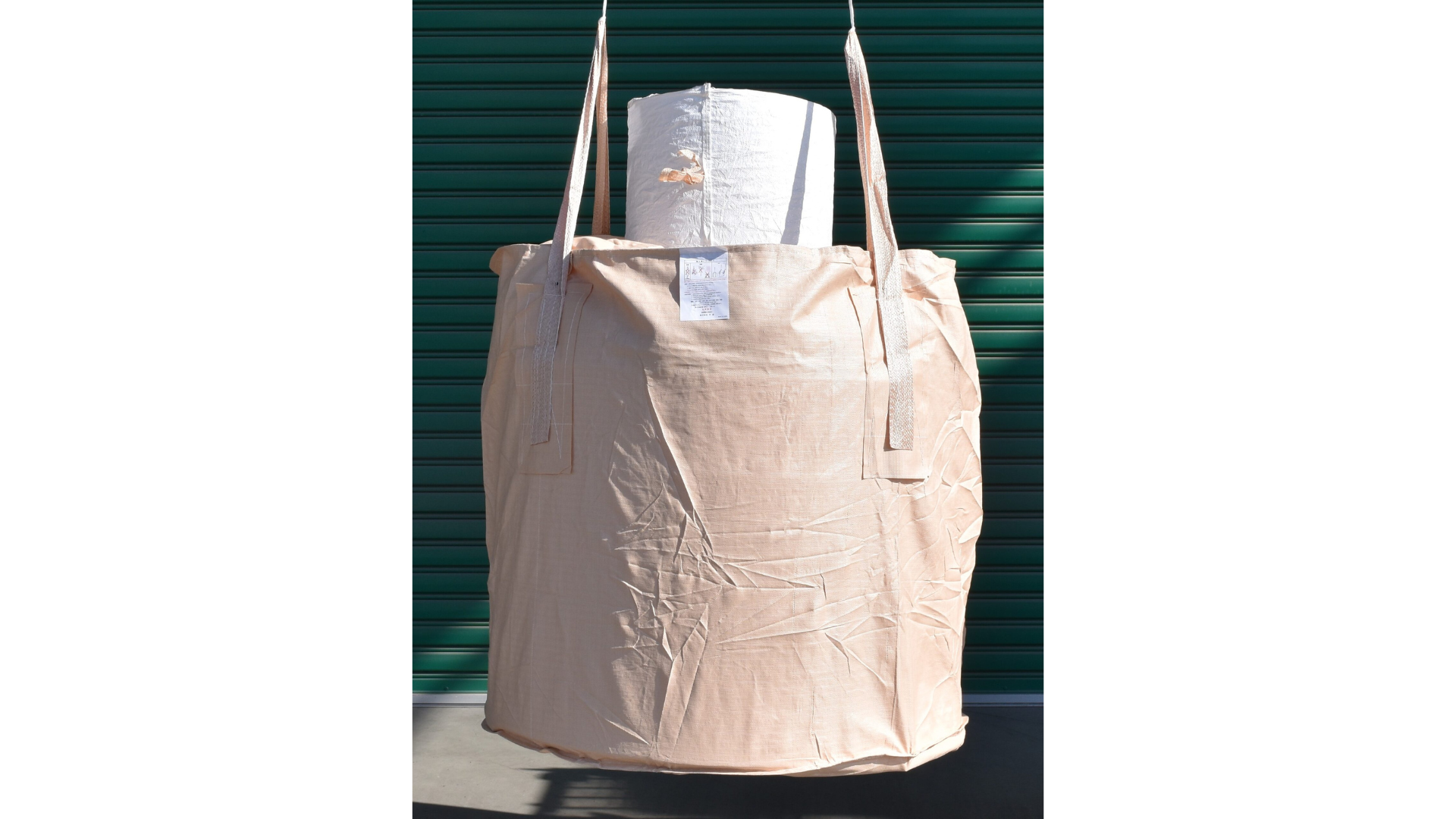 本体サイズはφ1,100mm × H1,100mmで、注入口(450φ×550H)を備えています。 充填作業がしやすく、軽量な原料や灰の投入がスムーズに行えます。 ラミネーション無し・内袋無し構造のため、通気性が高く、 湿気がこもりにくい仕様となっており、焼却灰や再生原料などの保管にも最適です。