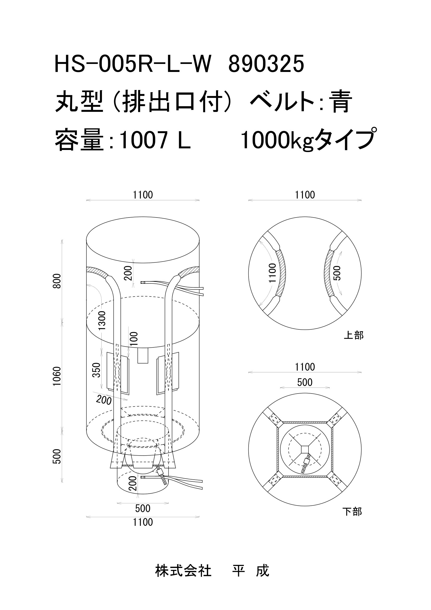 本体サイズは直径1,100mm × 高さ1,060mm。 注入口は全開タイプで充填が容易、 底部には500φ × 500Hの排出口を備え、内容物の排出もスムーズに行えます。 また、ベルトは青色で視認性に優れ、作業現場でも見やすく安全です。