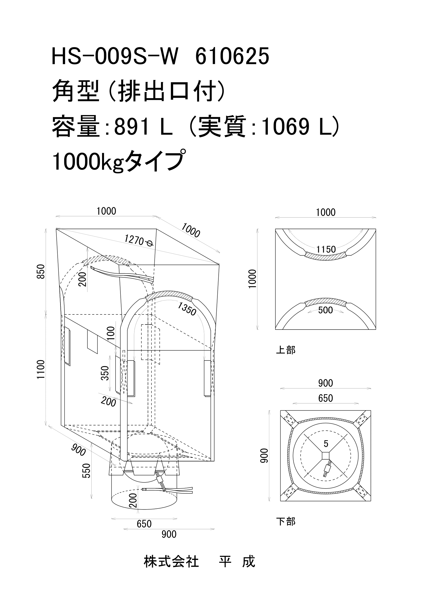 本体サイズは900W × 900L × 1,100H。 上部は全開注入口(1,270φ)、底部は650φ × 550Hの排出口を備え、 内容物の充填・排出をスムーズに行えます。 注入口が逆テーパー構造のため、折り返しが容易で投入作業の効率が向上します。
