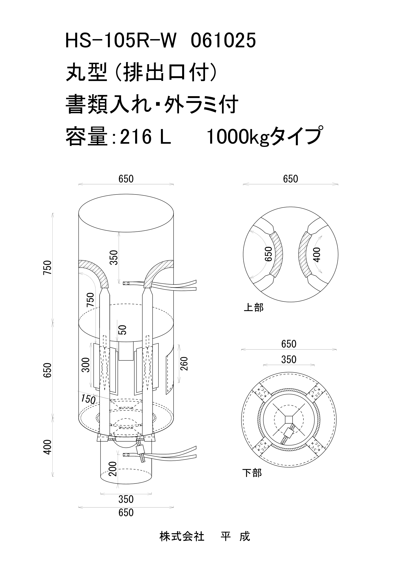 本体サイズは直径650mm × 高さ650mm。 上部は全開注入口、底部は350φ × 400Hの排出口を備え、充填・排出がスムーズに行えます。 注入口逆テーパー構造により、内容物の投入が容易で作業効率を高めます。